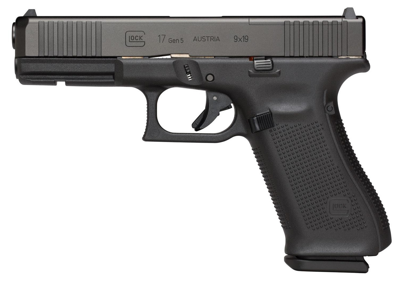 The GLOCK 17 Gen5 features a no finger grooved, multiple backstrapped, rough textured frame with hundreds of miniature spikes which results in remarkable traction for extreme environments and gloved operators. The frame also features a smooth trigger, reversible mag release, and ambidextrous slide stop. The magazine comes with a floor plate which is extended at the front for faster magazine change, and an orange follower, while the flared mag-well makes it easier to funnel the magazine into the mag-well. Glock’s nDLC finish provides a tougher, more durable protection against corrosion and scratching. The Glock Marksman barrel features a barrel rifling which delivers improved accuracy. This Glock Gen5 MOS FS model has front slide serrations, fixed sights, Modular Optic System, and a 17-round capacity.
