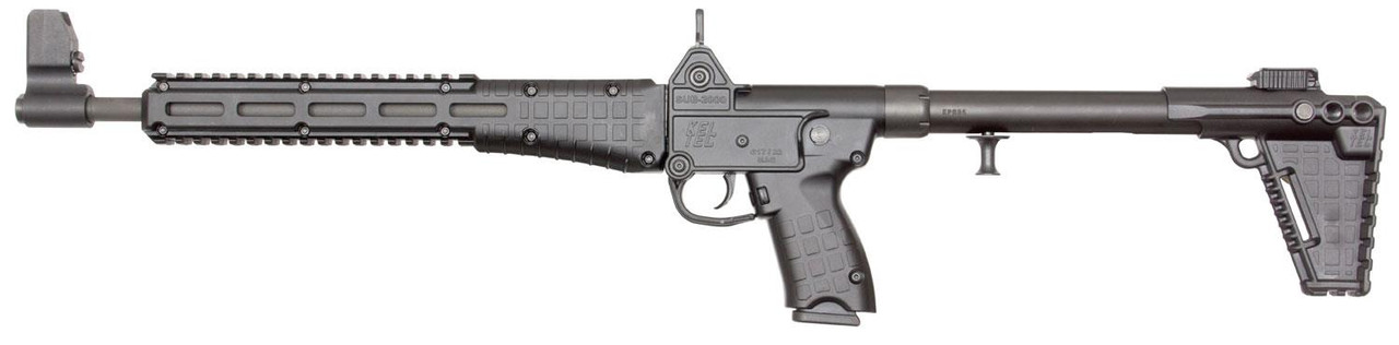 Kel-Tec’s semi-automatic Sub-2000 is a rifle chambered for pistol cartridges and can accept most double column handgun magazines. The Sub-2000 is classified as a “sub-rifle” because of its small size, light weight, and the use of a pistol cartridge. It is intended as a compliment to the handgun with which it would have full interchangeability in ammunition and magazines. Easily be disassembled for cleaning or inspection without tools, it is ideal for backpacking trips and situations where space and convenience are paramount. By rotating the barrel upwards and back, the Sub-2000 can be instantly reduced to a size of 16.25″ x 7″ for ease of storage. The Sub-2000 has a 3-position stock providing an adjustable LOP (13-14.25″), and two integrated Picatinny rails on the forend for mounting accessories. The ergonomic charging handle is located under the bolt tube for ambidextrous operation. It has a ghost ring rear sight and an adjustable front sight with a removable T6 6061 aluminum housing. This model comes with a 15-round magazine. It is compatible with Glock 17 and 19 mags.