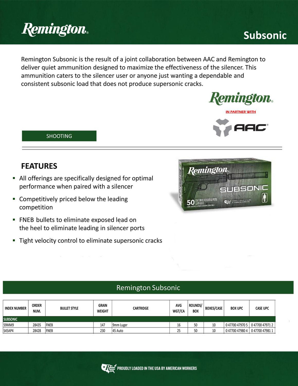 Remington Silencer Subsonic Ammo is the result of a joint development team comprised of Remington & AAC. Specifically designed for optimal performance when paired with a silencer with tight velocity control to eliminate supersonic cracks.