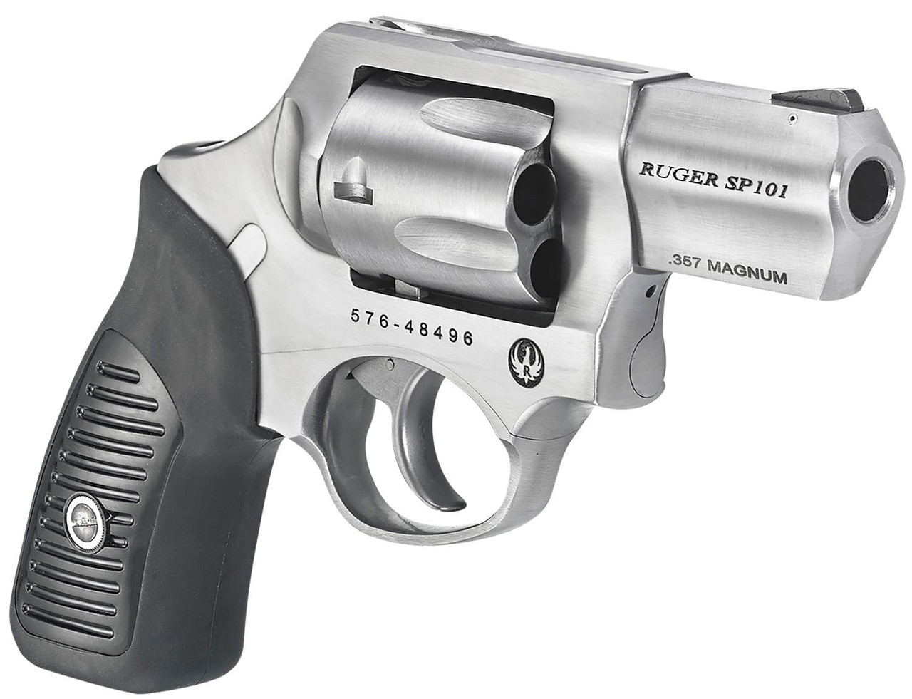 The Ruger SP101 revolver features a smaller Ruger cushioned grip system with no exposed metal at the back strap for shooter comfort. The patented triple locking cylinder mechanism securely locks the cylinder into the frame at the front, rear, and bottom. Its stainless steel frame has no weakening side plates. This model has a 2.25″ stainless steel barrel, frame, and cylinder. It also has a black rubber grip with a black synthetic insert, black ramp front with an integral rear sights, and a spurless hammer.