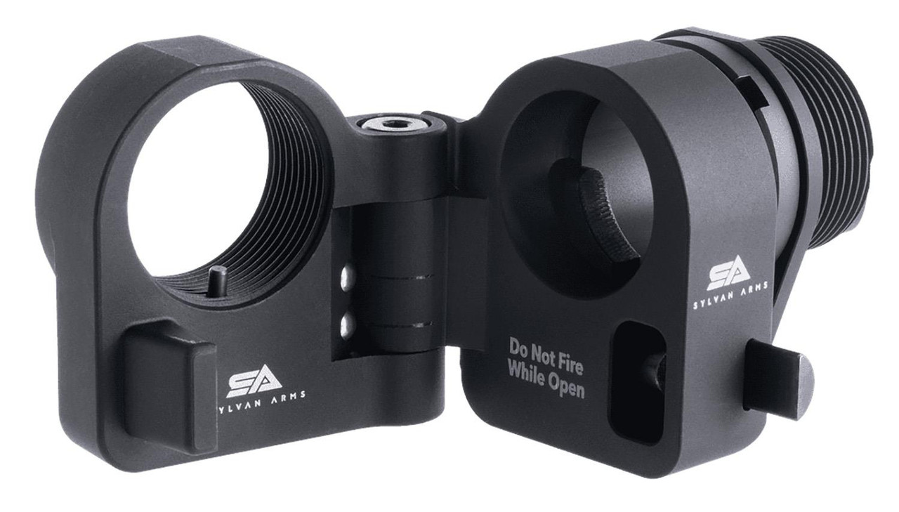 The Sylvan Arms Folding Hinge Stock Adapter allows you to fold your stock and significantly reduce the length of your rifle for easy stow and travel. Specifically designed for gas piston and direct impingement systems 5.56 to .308 systems, as well as .223 compatible, it has standard 1-3/16 x 16 thread and does not require any additional parts to be used with standard BC Groups. It is CNC-machined in the USA from 7075 Billet Aluminum, making it uniquely lightweight and corrosion resistant. This assembly weighs only 6.0 ounces. No special tools required; only a standard armorers wrench. The product does not need to be disassembled in order to install it on to your .223/5.56 to .308 & most 9mm rifle/pistol.